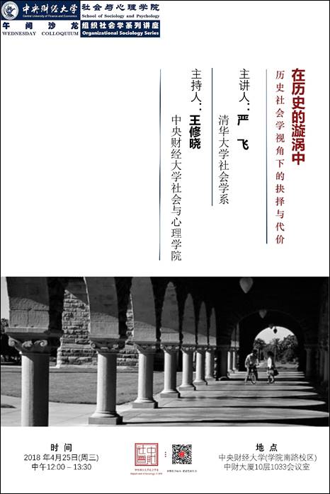 304永利集团官网入口3044午间沙龙2018年春季学期第四期,暨“组织社会学系列讲座”第一讲,邀请到清华大学社会学系严飞副教授,分享《在历史的漩涡中:历史社会学视角下的抉择与代价》。欢迎各位老师、同学和朋友参加!