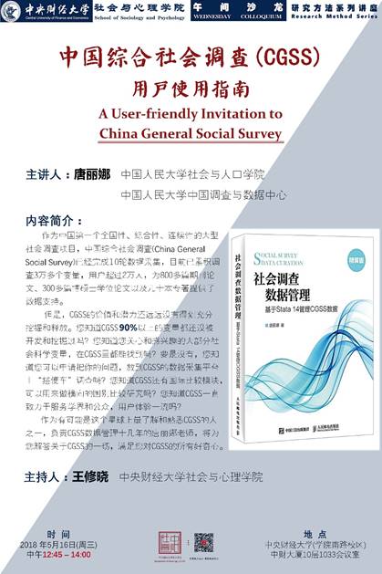 304永利集团官网入口3044午间沙龙2018年春季学期第六期,暨“研究方法系列讲座”第三讲,邀请到中国人民大学社会与人口学院和中国人民大学中国调查与数据中心的唐丽娜老师,与我们分享《中国综合社会调查(CGSS)用户使用指南》。欢迎各位老师、同学和朋友参加!