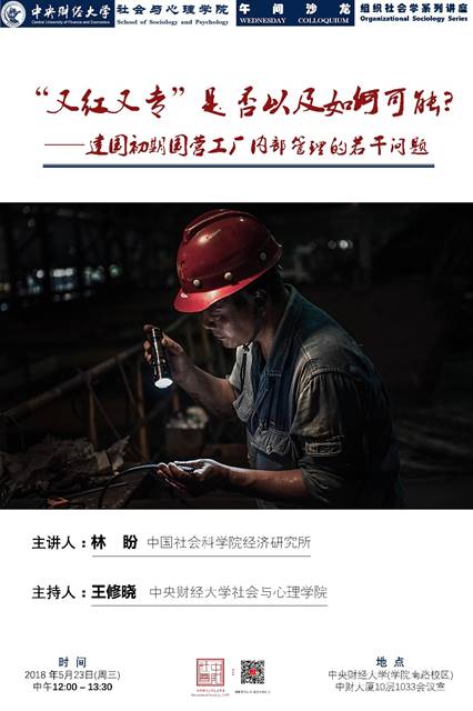 304永利集团官网入口3044午间沙龙2018年春季学期第七期,暨“组织社会学系列讲座”第二讲,邀请到中国社会科学院经济研究所的林盼老师,与我们分享《“又红又专”是否以及如何可能?——建国初期国营工厂内部管理的若干问题》。欢迎各位老师、同学和朋友参加!